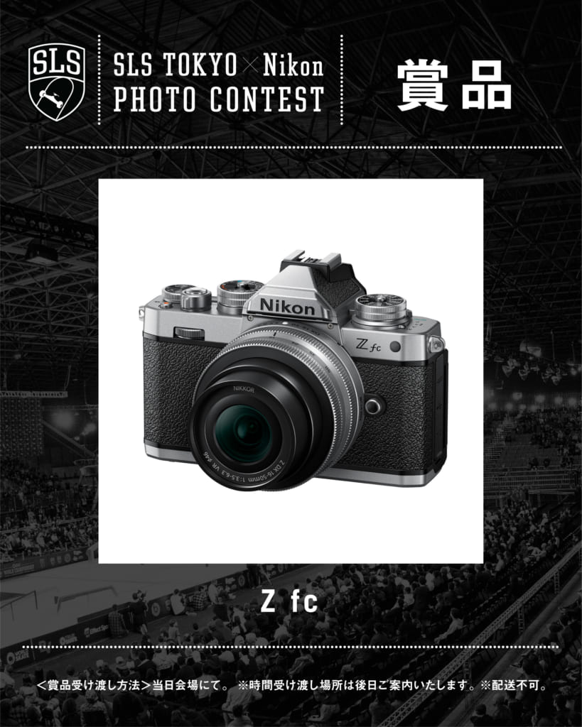 一次審査は7/6(木)13:00~7/31(月)23:59までの期間で募集が行われ、日本時間の 8/4(金)19:00に通過作品10点をSLS TOKYO Instagramアカウントより発表される。最終審査は8月12日(土)の「2023 SLS CHAMPIONSHIP TOUR – TOKYO presented by Nikon」会場で行われ、最優秀賞には初めて触れる方にも、プロの写真家の方にも使いやすいニコンのミラーレスカメラ「ニコンZ fc」が贈呈される。